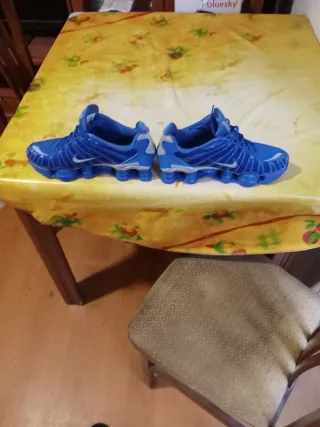 Zapatillas Nike Shox en talla 42. Diseño moderno y deportivo. - Combinación de colores azul y plateado. - Suela con tecnología Shox para amortiguación.