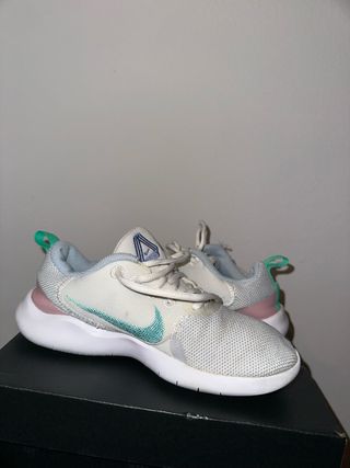 Zapatillas deportivas Nike para mujer, talla 36. Diseñadas para ofrecer comodidad y estilo. - Parte superior de malla transpirable. - Suela flexible para mayor amortiguación. - Detalle de logo Nike en el lateral. - Combinación de colores blanco, verde azulado y rosa pálido. - Solo estrenadas - Se envían en caja y protegidas (no su caja original)