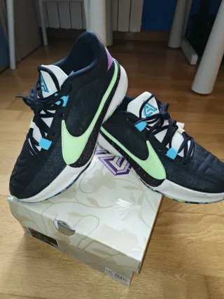 Zapatillas deportivas Nike Zoom Freak 5 con un diseño llamativo. - Combinación de colores negro y verde. - Detalles en morado y azul. - Suela con diseño multicolor.