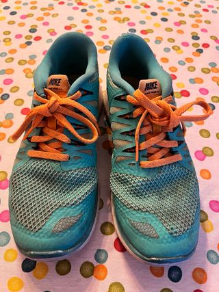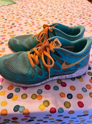Zapatillas deportivas Nike Free en llamativos tonos azules y naranjas. Perfectas para tus entrenamientos en gimnasio. Sólo 4 usos porque me quedan un poco justas. - Diseño moderno y deportivo. - Detalles en color naranja. - Buena estabilidad y refuerzo lateral