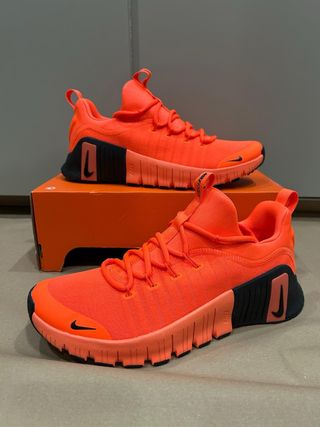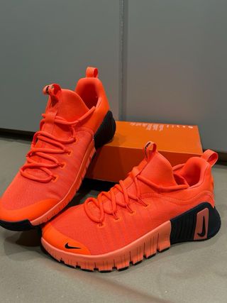 Zapatillas deportivas Nike Free Metcon 6 en talla 42.5. Diseñadas para ofrecer comodidad y rendimiento. - Color naranja vibrante con detalles en negro. - Suela flexible y duradera. - Cierre de cordones. - Logo de Nike visible.