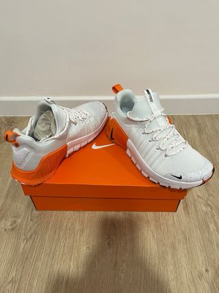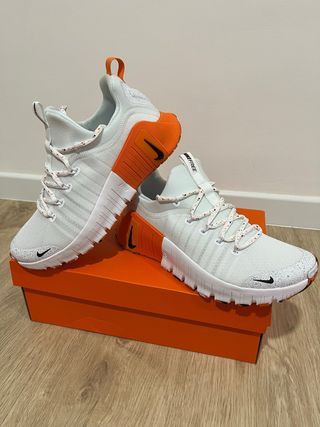 Zapatillas deportivas Nike Free Metcon 6 en talla 41. Blanco/Naranja con detalles en negro (Nuevas en embalaje original sin usar) - Entrenamiento Híbrido o Fitness. - Diseño moderno y funcional. - Cordones con motas Naranjas. - Swoosh de Nike en Negro. - Compradas en página Oficial NIKE.