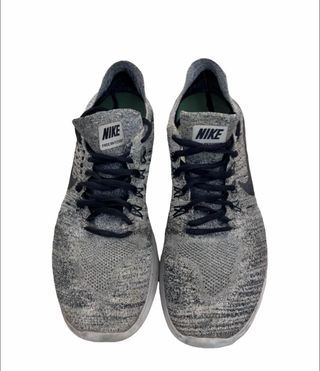 Nike Free Rn Flyknit zapatillas Running 2017, talla 43, color gris con el logo de la marca en negro hecho de poliéster y malla y la suela de color blanco hecha de caucho. Perfectas para correr y después de 8 años en buen estados con evidentes signos de desgaste por pase de los años, tal y como se ve en las fotos, pero sin ningún desperfecto funcional. Son de caña baja, puntería cerrada y de talón plano con plantillas anatómicas adaptadas para maratones y corridas largas. En su tiempo costaron 135€ en la tienda oficial de Nike. Número de serie: 880843-101