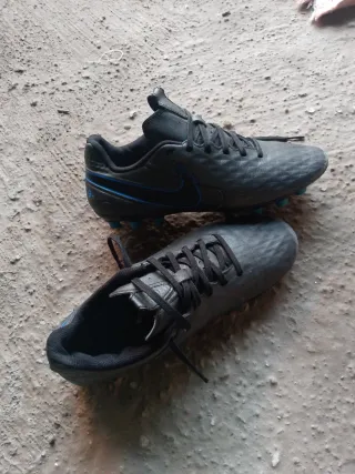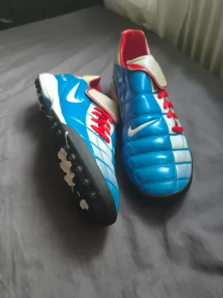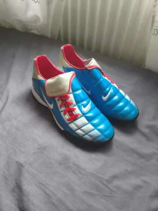 Zapatillas de fútbol sala de la marca Nike. Modelo performance tiempo leyend 10 - Color azul con detalles blancos. - las ha usado 3 veces, dejo de usarlas porque se le quedaron pequeñas ( las compro muy justas) El polvo blanco es para protegerlas por dentro de los olores y humedad, se le quita si se sagude.