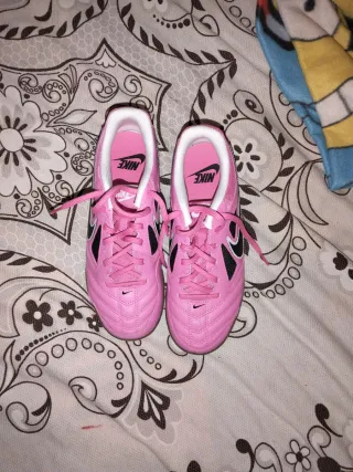 Zapatillas de fútbol para niño con un diseño moderno y llamativo. - Color principal azul claro. - Detalles en color rosa vibrante. - Marca Nike. tengo talla 33 y 35. A ESTRENAR !!’n NO NEGOCIABLE.
