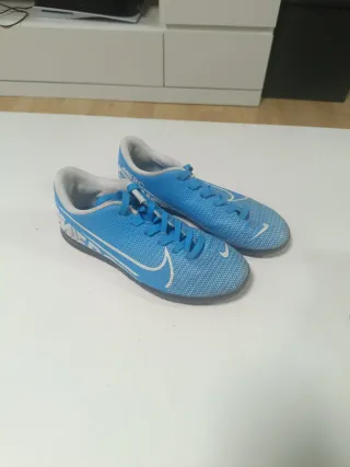 Zapatillas de fútbol sala Nike en color azul con detalles blancos. Perfectas para jugar en pistas interiores. COMO NUEVAS, usadas 1 partido pero le quedan pequeñas. - Diseño deportivo. - Suela de goma para mayor agarre.