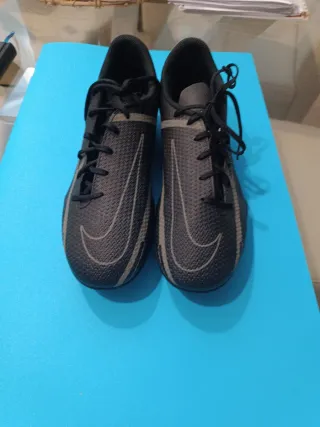 Zapatillas de fútbol Nike JR PHANTOM GX II ACADEMY en color negro. la suela de una tiene restos de pegatina pero con halcón sale, talla 38 europea. también regaló espinilleras azules KIPSTA y medias. Ideal para empezar.