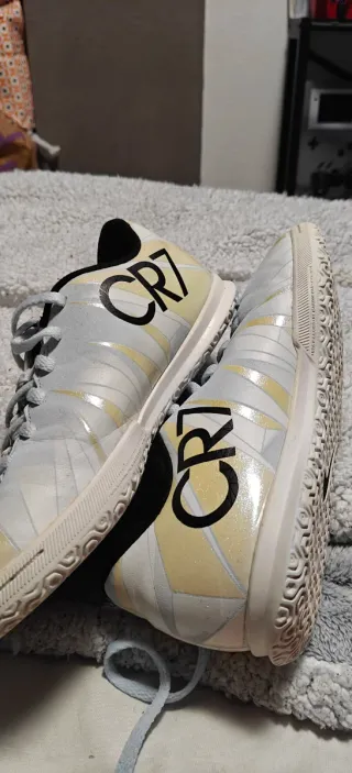 Zapatillas de fútbol sala con el distintivo diseño CR7. - Combinación de colores oro y blanco. - Marca Nike.