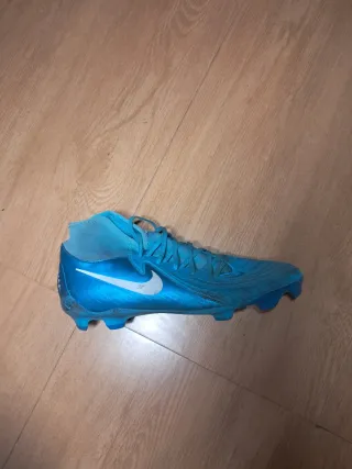 Zapatillas de fútbol Nike con un diseño moderno y llamativo. - Color principal negro con detalles en azul. - Cuello alto para mayor sujeción. - Suela con tacos para césped. Tienen dos puestas me aprietan en el empeine por eso las vendo para pie estrecho