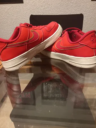 Zapatillas Nike Air Force 1 en color rojo con detalles dorados. - Diseño clásico. - Cordones rojos. - Suela blanca. - Más cosas en mi perfil.