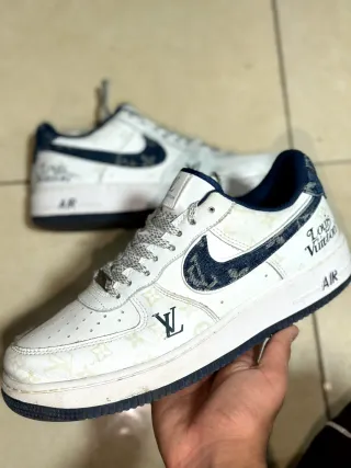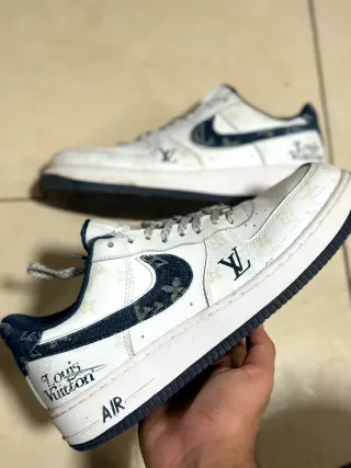 Zapatillas Nike de estilo urbano con diseño inspirado en Louis Vuitton. Presentan una base blanca con monograma tipo LV en varias zonas y detalles en azul marino, incluyendo el swoosh en tejido tipo denim con patrón visible. Diseño llamativo y elegante, ideal para streetwear. Fabricadas en piel sintética con acabados lisos, interior textil acolchado para mayor comodidad y suela de goma resistente. Cordones textiles gruesos con detalle metálico. Tallas según etiqueta: EU 43 UK 8,5 US 9,5 27,5 cm de longitud de pie Buen estado general, tal y como se aprecia en las imágenes, donde también se ve la etiqueta interior original de Nike. 💰