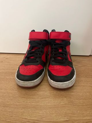 Zapatillas deportivas altas de la marca Nike. - Combinación de colores rojo y negro. - Cierre con velcro en la parte superior.