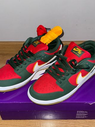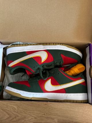 Zapatillas Nike SB Dunk Low inspiradas en los Seattle Supersonics. Incluyen cordones adicionales. - Diseño con paneles en rojo y verde. - Swoosh lateral en blanco con borde amarillo. - Suela de goma. - Caja original incluida.