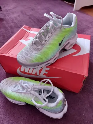 Zapatillas Nike TN Air Max con un diseño degradado en blanco y verde neón. - Cordones blancos. - Swoosh negro en el lateral. - Suela blanca con detalles. - Caja original incluida.
