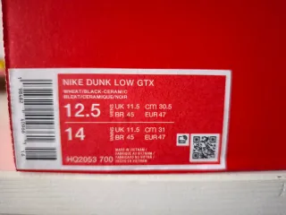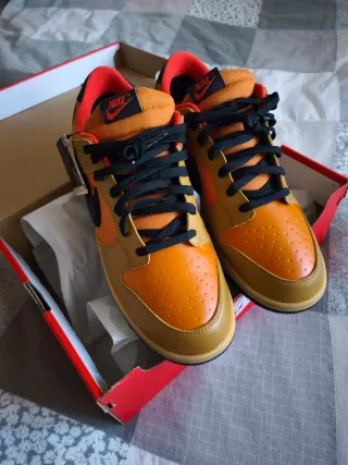 Zapatillas Nike Dunk Low GTX en talla 47 (tallan pequeño, son para alguien que tenga una 46 o un 45'5). Impermeables, GORETEX. Combinan tonos marrones, naranjas y negros. Son un regalo de reyes pero me quedan pequeñas, costaron 140€ y están con las etiquetas y sin estrenar.