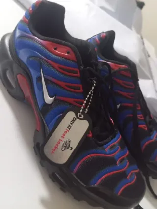Zapatillas deportivas Nike Air Max Plus TN con un diseño llamativo. - Combinación de colores vibrantes. - Detalles en rojo y azul sobre base negra. - Swoosh plateado característico de Nike. Nuevos sin uso conserva etiqueta original