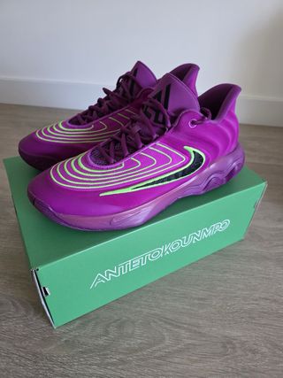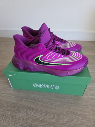 Zapatillas de baloncesto Nike Giannis Immortality en llamativos tonos morados y verdes. Se han usado solo una vez - Diseño con líneas curvas en la parte delantera. - Swoosh negro en el lateral. - Cordones a juego.