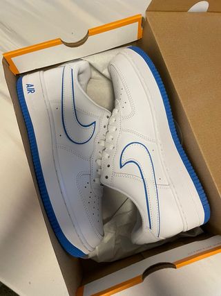 Vendo un par de zapatillas Nike Air Force 1. Son de color blanco con detalles azules. Están impecables, nuevas a estrenar. - Ideales para un look casual. - Talla disponible: la de la foto. - Se venden en su caja original.