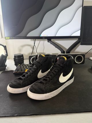 ❌ Cuidado con las réplicas baratas de 30€. Estas son 100% Originales Nike. Vendo zapatillas Nike Blazer Mid '77 Vintage en color negro y blanco. Talla 42 EU. Estado: Están prácticamente nuevas, usadas solo 2 veces reales. Las vendo porque no las uso. ℹ️ No tengo la caja original, pero entrego en mano o envío bien protegidas. Son unas zapatillas muy versátiles, perfectas para vestir a diario o para entrenar (muy usadas para gym/powerlifting por la suela plana). Precio en tienda: +100€. Bambas, tenis, deportivas, botines, nike altas, jordan, air force, skate, sb, gimnasio, retro, moda hombre, chico.