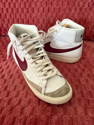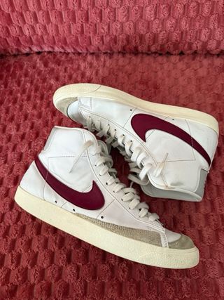 Zapatillas altas Nike Blazer Mid '77 Vintage. - Diseño clásico. - Combinación de cuero y gamuza. - Cordones blancos. - Swoosh lateral en color burdeos. - Detalle en el talón con la letra 'N'.