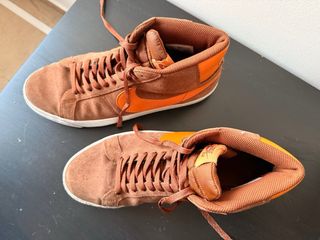 Zapatillas altas Nike SB Zoom Blazer Mid en tonos pecan y curry. Las zapatillas no se han usado mucho, pero tienen signo de desgaste, sobre todo en la goma blanca y en los cordones.