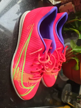 Zapatillas de fútbol sala de la marca Nike, en llamativos tonos rosas y verdes. Ideales para la práctica deportiva. Ergonómicas, sin usar regaladas a mí niño le quedan pequeñas . - Diseño deportivo. - Cierre con cordones.