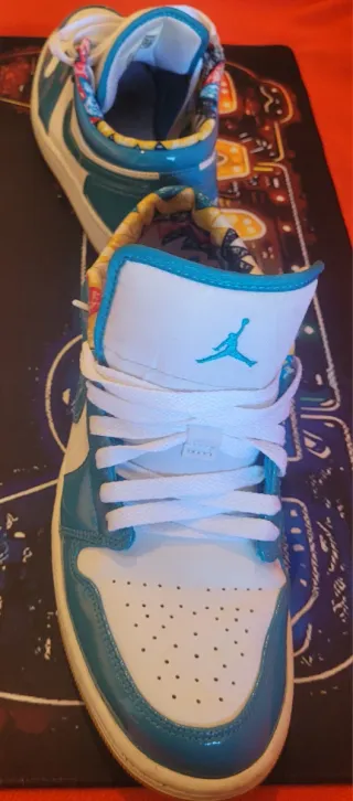 Zapatillas deportivas Nike Jordan con un diseño llamativo. - Combinación de colores azul turquesa y blanco. - Detalle de estampado floral en el interior. - Logo de Jordan en la lengüeta.
