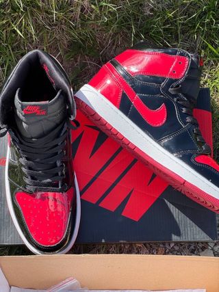 Vendo un par de zapatillas Nike Air Jordan 1 High OG. Son preciosas y están en perfecto estado. - Modelo: Air Jordan 1 High OG - Material: charol - Color: combinación de rojo y negro