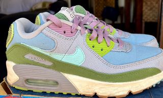 Zapatillas deportivas Nike Air Max 90 para mujer, con un diseño colorido y moderno. Excelente estado (puestas solo 2 veces). Muy cómodas y modernas. - Precio original: 140€. Venta: 45€ - Combinación de tonos pastel y verde fluo. - Detalle de Swoosh característico de la marca. - Suela con tecnología Air Max visible.