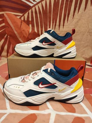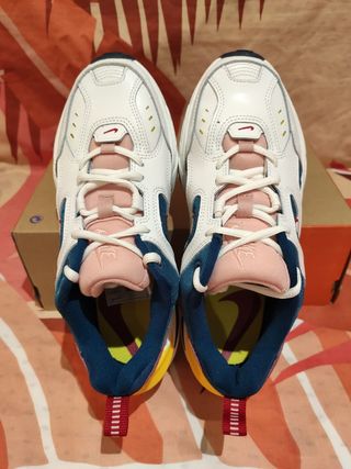Zapatillas Nike M2K originales con un diseño moderno y llamativo. - Combinación de colores morado, azul y naranja. - Logo de Nike en amarillo. - Suela blanca y azul. Me las compré cuando se pusieron de moda por antojo y las habré usado un par de veces. Acepto otras ofertas
