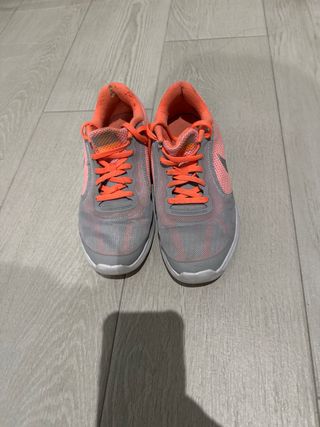 Zapatillas deportivas Nike, talla 37,5. Son de color naranja y rosa. Están en buen estado, aunque muestran señales normales de uso. . Muy ligeras, transpirables y cómodas.
