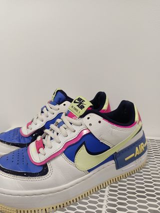 Zapatillas deportivas Nike Air Force 1 Shadow con un diseño moderno y llamativo. - Combinación de colores vibrantes: azul, rosa, blanco y amarillo. - Detalle de logo en el lateral. - Cordones blancos. **VER TODAS LAS FOTOS** HAGO ENVIOS