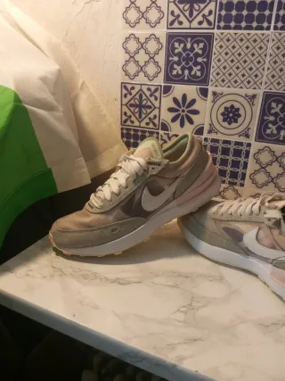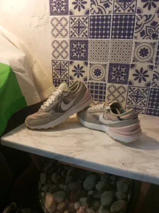 Zapatillas deportivas Nike en talla 35. Combinan tonos grises y rosados para un estilo moderno. - Diseño deportivo. - Cierre con cordones.