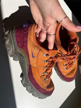 Zapatilla de estilo outdoor con un diseño llamativo. - Combinación de colores naranja y morado. - Detalle de swoosh morado. - Cordones naranjas con detalles morados. - Suela gruesa y robusta. vendo por mudanza