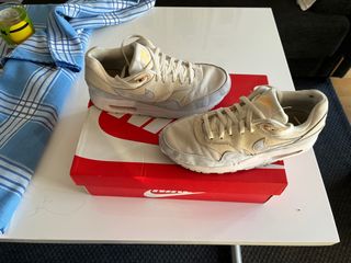 Zapatillas Nike Air Max 1 en talla 38. - Diseño en tonos beige y gris. - Logo de Nike en el lateral. parecen arañadas pero es por el tipo de tela gris/metalica. tan solo roces de la parte inferior del pantalon con la zapatilla. modelo de chica pero mi hijo las ha llevado perfectamente 100x100 originales