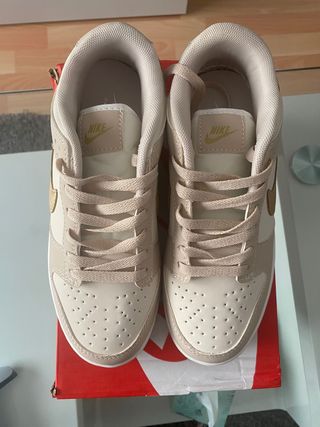 Zapatillas deportivas dunk con un diseño moderno y elegante. - Combinación de colores beige y dorado. - Detalle de logo en la lengüeta. - Perforaciones en la puntera.
