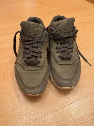 Zapatillas Nike Air Max 1 en color verde oliva con detalles en dorado. Talla 36 Muy cómodas, con suela Air Max que ofrece gran amortiguación. Están en buen estado general, con un uso normal y la suela blanca ligeramente marcada (como se ve en las fotos). Ideales para uso diario o para quien busque un look casual y urbano. ✔️ Originales Nike ✔️ Buen estado ✔️ Suela cómoda con cámara de aire