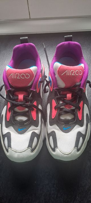 Zapatillas deportivas Nike Air Max 200 con un diseño moderno y llamativo. Sin caja. - Combinación de colores vibrantes: rosa, morado y blanco. - Detalles en azul y negro. - Cierre con cordones negros.