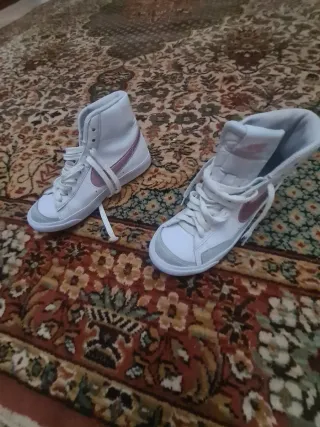Usadas 3 veces están en muy buen estado, es una zapatilla de bota, de piel, es de color blanco y tiene el tik de Nike en rosa claro, es la talla 38.