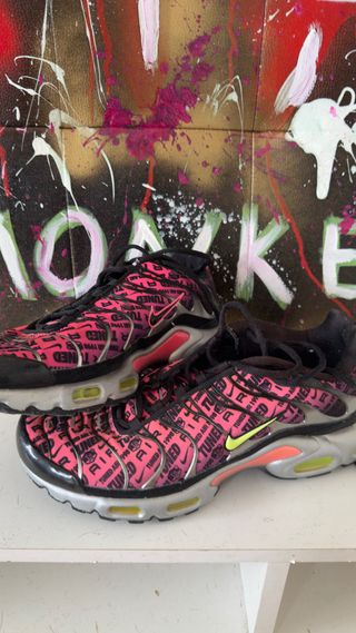 Zapatillas Nike TN Air con un llamativo diseño en rosa y negro. Perfectas para añadir un toque de color a tu estilo. - Diseño con estampado TUNED AIR 1998. - Detalles en color lima y coral. - Suela con cámaras de aire visibles.