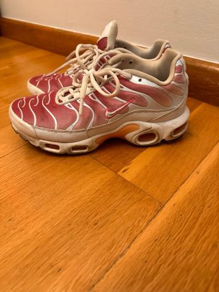 Zapatillas deportivas Nike TN con un diseño llamativo. - Combinación de colores rosa y blanco. - Detalles de líneas blancas. - Cierre con cordones.