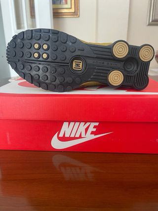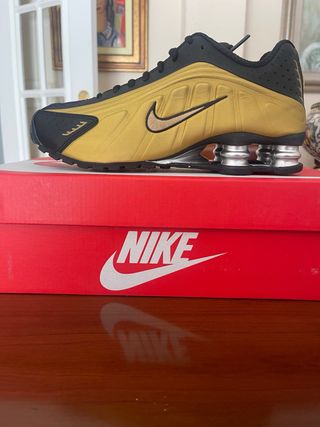 Zapatillas Nike Shox R4 con un diseño llamativo en dorado y negro. - Parte superior en cuero sintético y malla. - Sistema de amortiguación Shox con resortes. - Cierre de cordones. - Suela de goma para mayor tracción.
