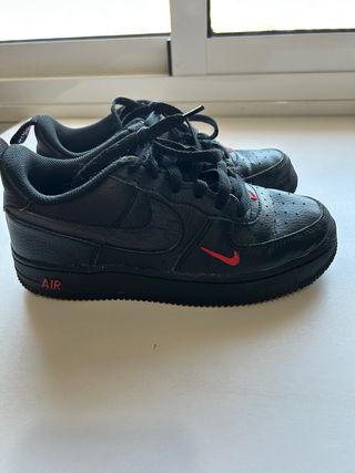 Zapatillas deportivas Nike Air Force. - Color principal negro. - Detalles en color rojo. - Diseño clásico de Air Force. Usadas, buen estado, con algún desperfecto del uso, se ve en las fotos, número 35,5, envío rápido