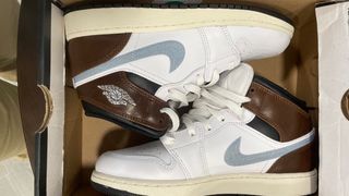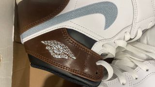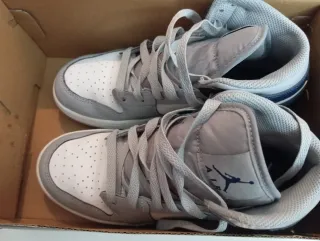 Zapatillas Nike Jordan Air 1 Mid. totalmente nuevas y 100% originales, talla niño pero vale para cualquier pie. - Combinación de colores blanco y marrón. - Detalle de swoosh en color azul claro. - Logo Air Jordan en el lateral.