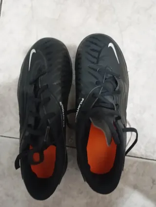 Zapatillas de fútbol para niño talla 35 - Diseño en color negro con detalles en naranja. - Marca Nike.