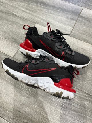 Zapatillas deportivas Nike React Vision en color negro con detalles en rojo. - Diseño moderno y llamativo. - Suela blanca con amortiguación. - Cierre con cordones negros.