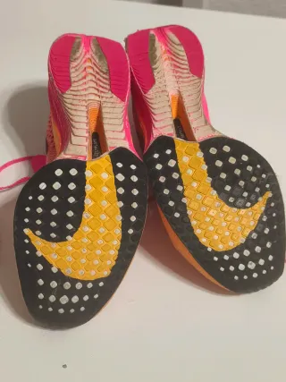 Zapatillas de running Nike Vaporfly 3. - Diseño ligero y transpirable. - Suela con amortiguación ZoomX. - Detalles en color rosa. - Placa de carbono. Dos usos, 7 y 8 km. Se venden porque mi pisada no se adapta a ellas.