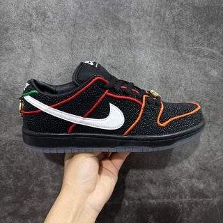 Zapatillas Nike SB Dunk Low con un diseño inspirado en Bronx Girls Skate. - Color principal negro con detalles en naranja y rojo. - Swoosh blanco característico de Nike. - Suela translúcida. - Cierre de cordones.