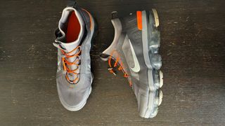 Zapatillas deportivas Nike Air Vapormax 2019 en tonos grises y naranjas. Diseño moderno y cómodo. - Cierre con cordones elásticos. - Suela con tecnología Vapormax. - Detalle de swoosh plateado.
