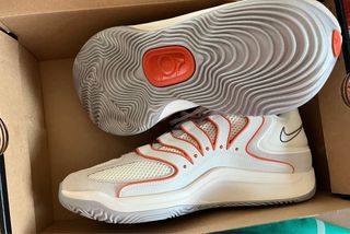 Zapatillas deportivas Nike KD 18 en tonos naranja y blanco. Diseño moderno y llamativo. - Parte superior de malla transpirable. - Detalles de diseño en color naranja. - Suela de goma para mayor tracción.
